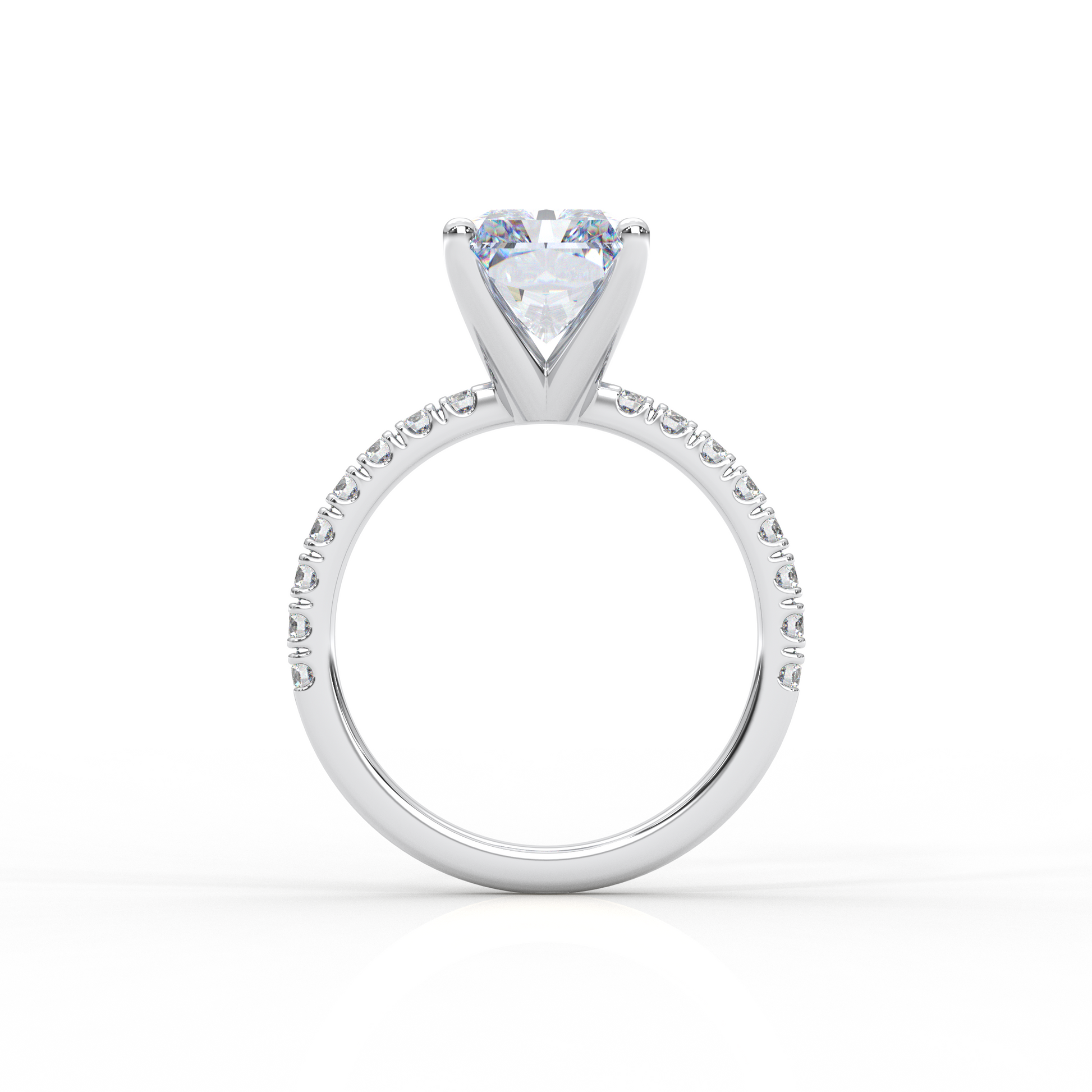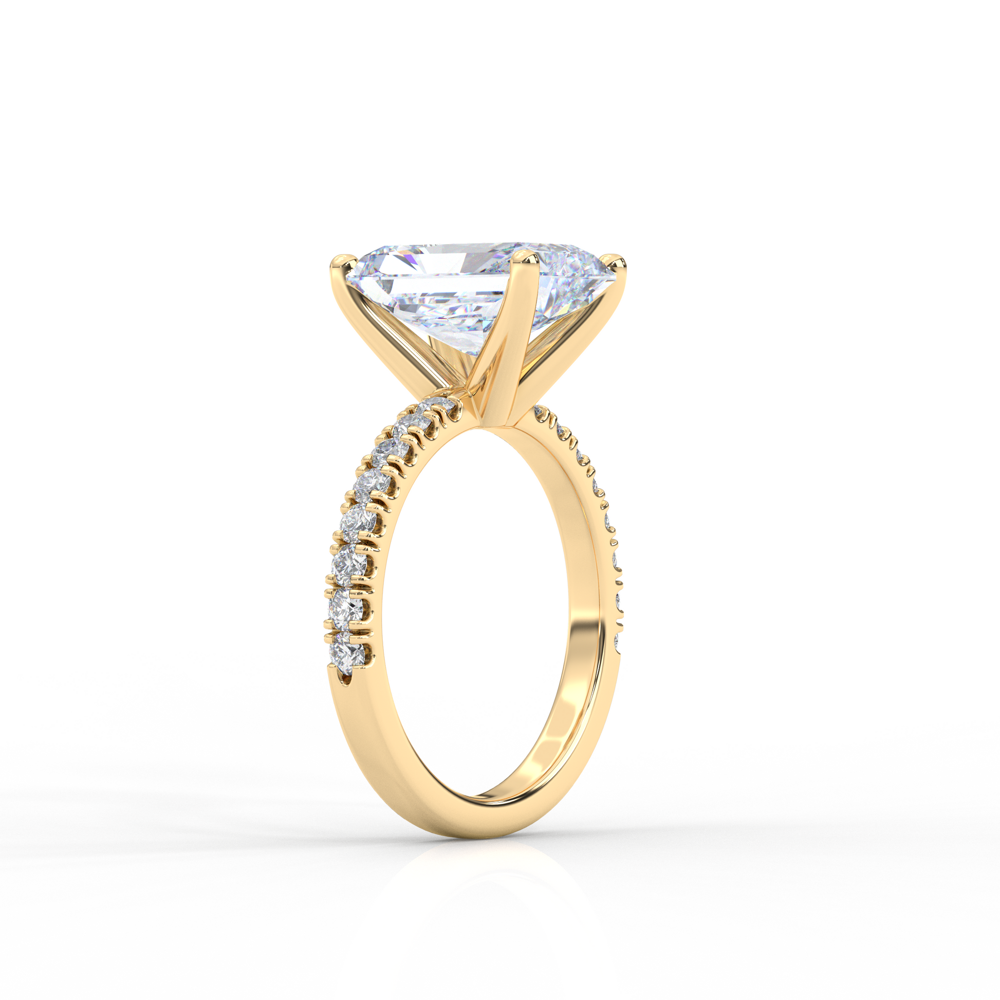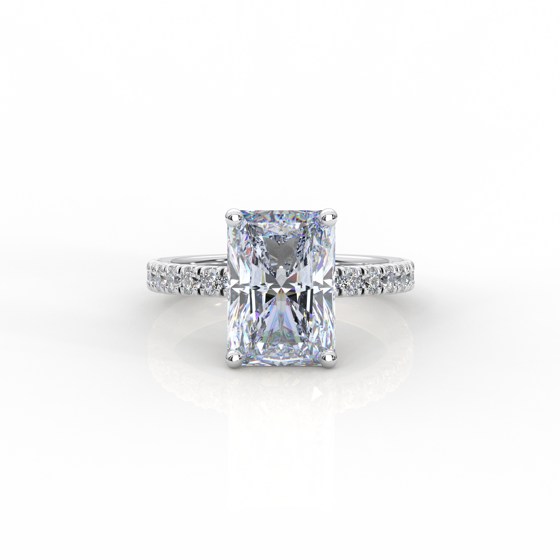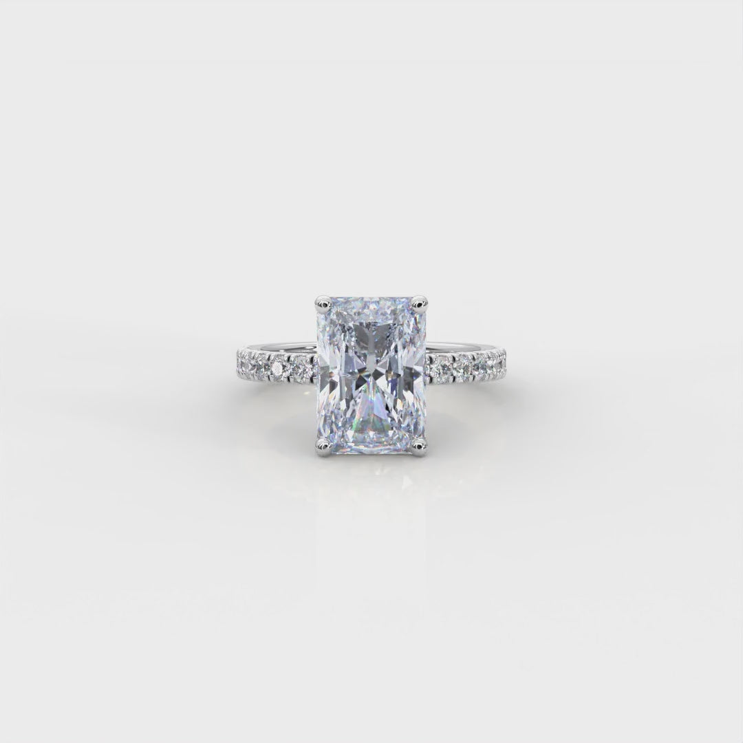 This elegant engagement ring showcases a striking 5.00 carat radiant-cut center diamond, celebrated for its brilliant sparkle and clean, modern lines. The center stone is set atop a refined band featuring French pavé-set diamonds, allowing light to enter from every angle for exceptional brilliance.