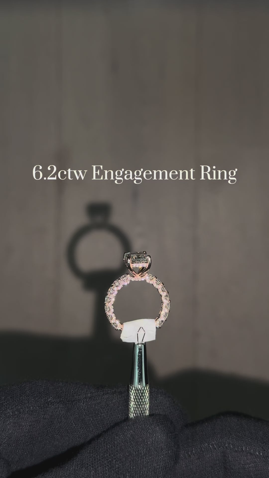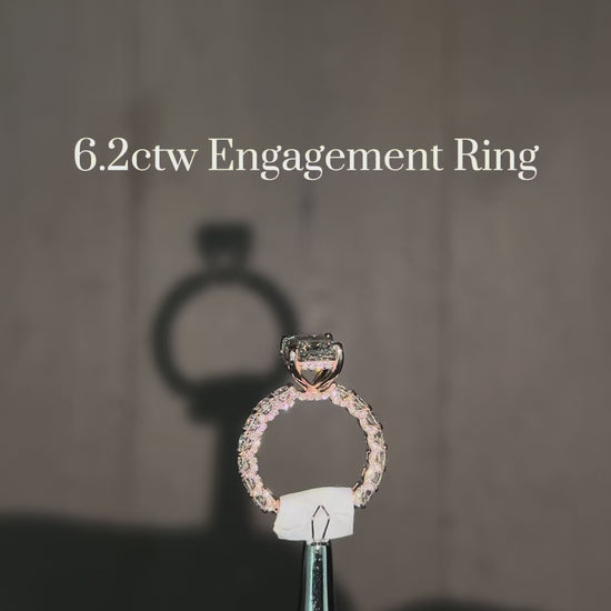 4ct Radiant center lab diamond (IGI certified VS1-F) set on 14k gold with a pave set diamond band.