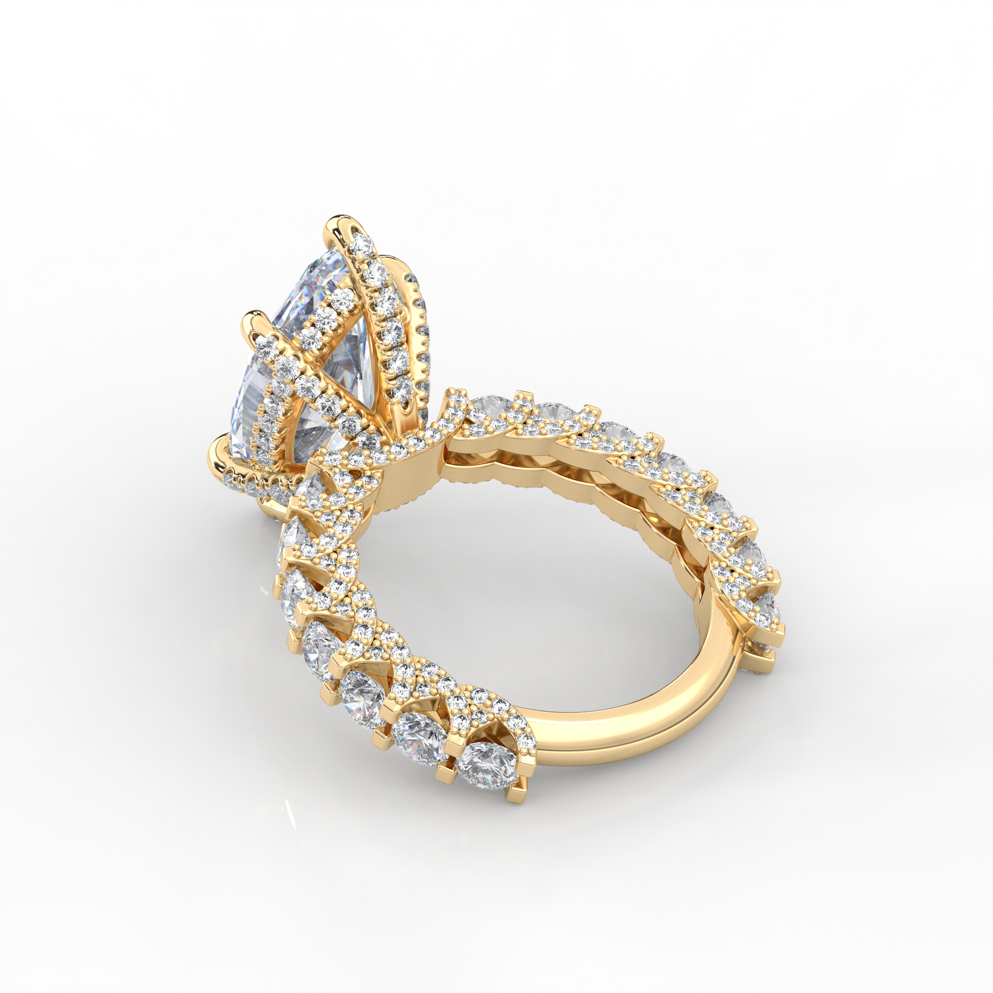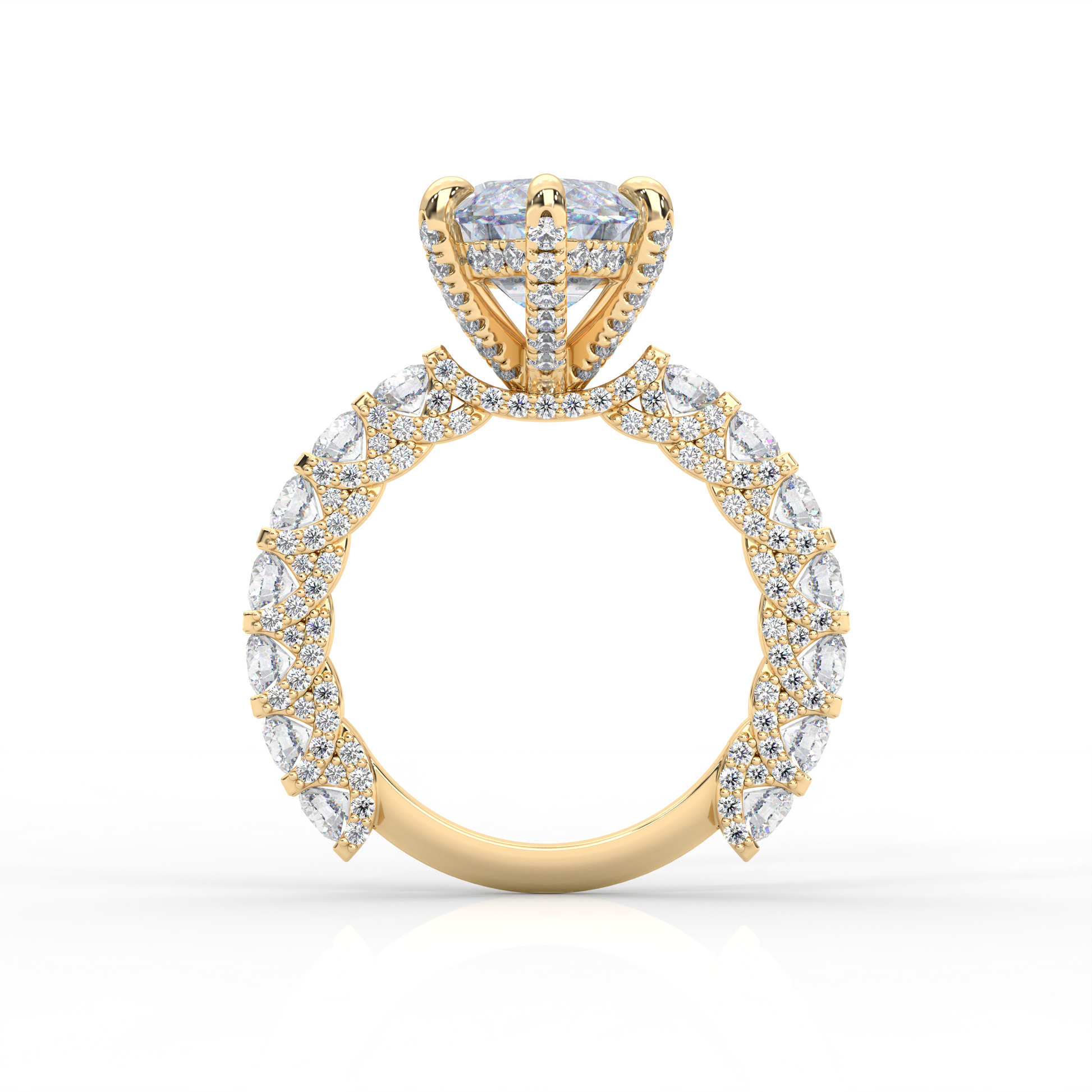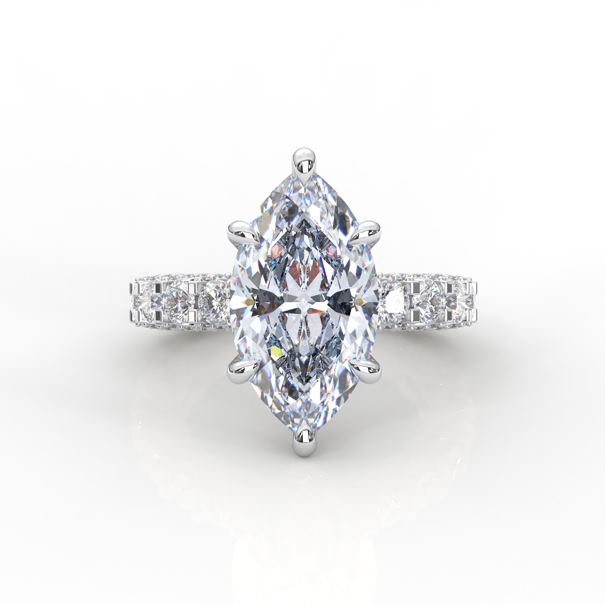 This elegant engagement ring is centered by an approximately 5.00 carat marquise-cut diamond, distinguished by its elongated silhouette and graceful brilliance. The center stone is graded VS1 clarity with F+ color, offering exceptional brightness and refined fire.